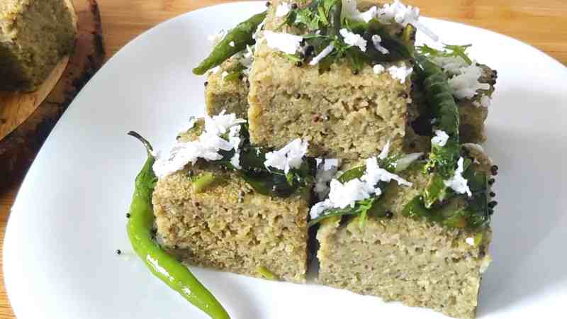 Green Moong Dal Dhokla is a steamed savory snack made with ground green moong dal and tempered with spices.